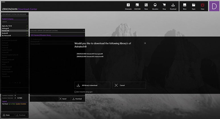 Dla wszystkich użytkowników exocad® i 3shape dostępne jest nowe Centrum pobierania bibliotek Zirkonzahn! Ten darmowy program umożliwia użytkownikom exocad® i 3shape pobieranie i zarządzanie w ich oprogramowaniu do projektowania, wszystkich komponentów implantów Zirkonzahn, które są obecnie dostępne dla ponad 100 systemów implantów (analogi laboratoryjne, bazy tytanowe, skanmarkery, białe skanmarkery). W celu szybkiego pobrania, biblioteki systemów implantologicznych można również wybierać indywidualnie.