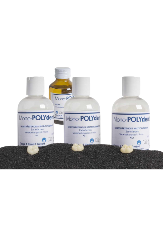 Proszek i płyn do wykonywania tymczasowych koron i mostów. Mono-POLY dentin bazuje na polimetakrylanach i nie zawiera kadmu. Ponieważ Mono-POLY dentin nie zawiera amin trzeciorzędowych, nie osiąga wysokich temperatur podczas utwardzania. Dlatego wykazuje minimalny skurcz i nie ulega deformacji. Mono-POLY dentin jest samoutwardzalną żywicą, która zawiera tylko 0,8% resztkowego monomeru i jest zalecana do długotrwałych tymczasowych uzupełnień w implantologii.