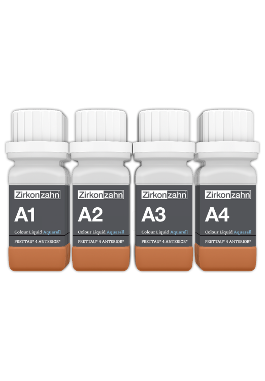 Zakres kolorów Colour Liquid Prettau® 4 Anterior Aquarell w zasadzie odpowiada 16 kolorom obejmującym całe chromatyczne spektrum odcieni Vita. Bezkwasowe koloryzujące płyny na bazie wody opracowane dla materiału cyrko Prettau® 4 Anterior. W celu wizualnej pomocy te płyny posiadają wypalające się bio pigmenty.