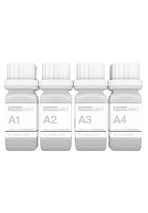 Nowe bezkwasowe barwniki na bazie wody do barwienia i cieniowania prac z cyrkonu przez zanurzanie. Nowe barwniki są na bazie wody i nie zawierają kwasu. Barwimy przez zanurzenie pracy. Barwienie bezkwasowymi barwnikami skraca czas suszenia konstrukcji o ponad 30 %. Nowa formuła tworzy cieplejsze i bardziej zbliżone do naturalnych kolory. Nowe płyny pokrywają całą paletę kolorów od A1 do D4. Wszystkie kolory są dostępne w 50 ml lub 100 ml butelkach.