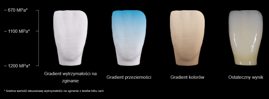- Cyrkon z technologią Gradual-Triplex-Technology: potrójny gradient o naturalnym zabarwieniu oraz zwiększających się wartościach wytrzymałości na zginanie i przezierności