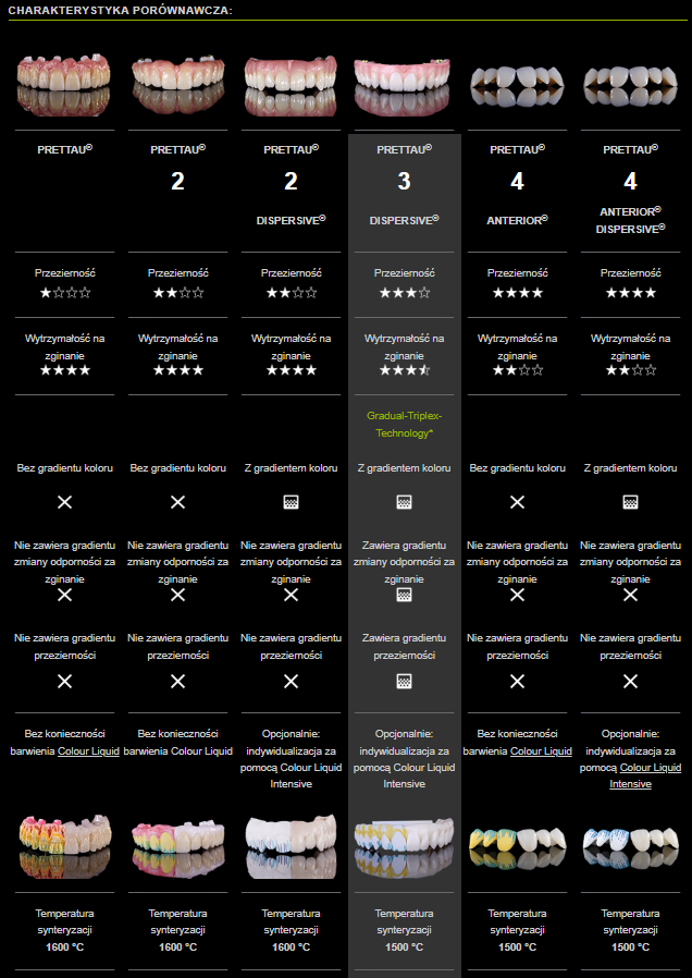 Cyrkon Prettau® Dispersive® od Zirkonzahn już na etapie produkcji otrzymuje delikatne i naturalne zabarwienie oraz płynne, dyspersyjne cieniowanie koloru. Dzięki technologii Gradual-Triplex opracowano potrójny gradient nowego cyrkonu Prettau® 3 Dispersive®. Oprócz zabarwienia zmienia się także przezierność i wytrzymałość na zginanie. Podczas gdy zwiększająca się przezierność w stronę brzegu siecznego skutkuje wysoce przezroczystą krawędzią brzegu siecznego, rosnąca w stronę szyjki zęba wytrzymałość na zginanie skutkuje niezwykle wysoką wytrzymałością w obszarze szyjki zęba. W związku z tym Prettau® 3 Dispersive® może być stosowany do wszystkich rodzajów uzupełnień z tlenku cyrkonu, chociaż jest szczególnie polecany do uzupełnień monolitycznych. Aby łatwo określić kolor odbudowy protetycznej odpowiadający zębom pacjenta, dostępne są specjalne kolorniki cyrkonu Prettau® 3 Dispersive® z próbnymi zębami w kształcie przedtrzonowców oraz górnych i dolnych siekaczy. Jeśli materiał kolornika i materiał korony cyrkonowej są identyczne, kolor uzupełnienia cyrkonowego odpowiadać będzie 1: 1 naturalnemu kolorowi zęba pacjenta.