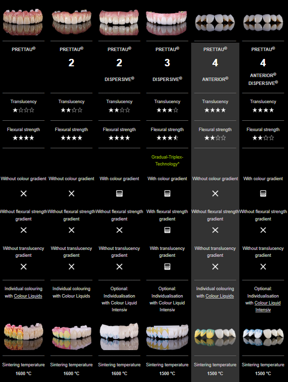 Dzięki zoptymalizowanej mikrostrukturze tlenku cyrkonu, Prettau® 4 Anterior® jest wysoce przezroczysty i estetyczny. W przeciwieństwie do ceramiki szklanej Prettau® 4 Anterior® jest polichromowym (wielobarwnym) materiałem. Oznacza to, że uzupełnienie z Prettau® 4 Anterior® może być barwione na różne kolory już przed procesem spiekania. W przypadku uzupełnień wykonanych z ceramiki szklanej, przed spiekaniem widać zaledwie odcienie koloru, a ostateczną barwę można uzyskać dopiero po zastosowaniu barwników. Temperatura spiekania Prettau® 4 Anterior® wynosi zaledwie 1500° C, co wiąże się z krótszym czasem spiekania.