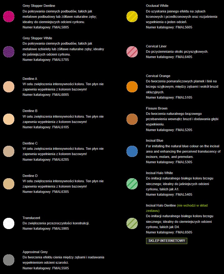 Jak działają: Wysoka gęstość pozwala na precyzyjne pociągnięcia pędzlem przy minimalnym wchłanianiu płynu przez strukturę. Jednak w przypadku zastosowania na białym cyrkonie, widoczny efekt kolorystyczny nie odzwierciedla efektu końcowego, który pojawi się po synteryzacji. Po synteryzacji, nadmiernie błyszczące efekty można zredukować, ostrożnie usuwając wierzchnie warstwy za pomocą specjalnych wierteł diamentowych do cyrkonu, lub dodatkowo uszlachetnić i ukształtować, stosując ICE Stains 3D firmy Enrico Steger i Fresco Ceramics.