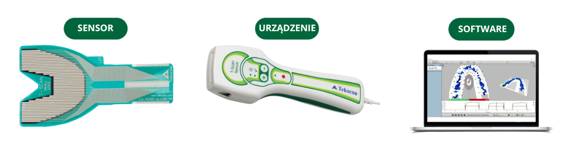 - Obrazowanie w postaci kolorowego wykresu sił działających w sposób ciągły na ząb, zespół zębów i/lub cały zgryz.